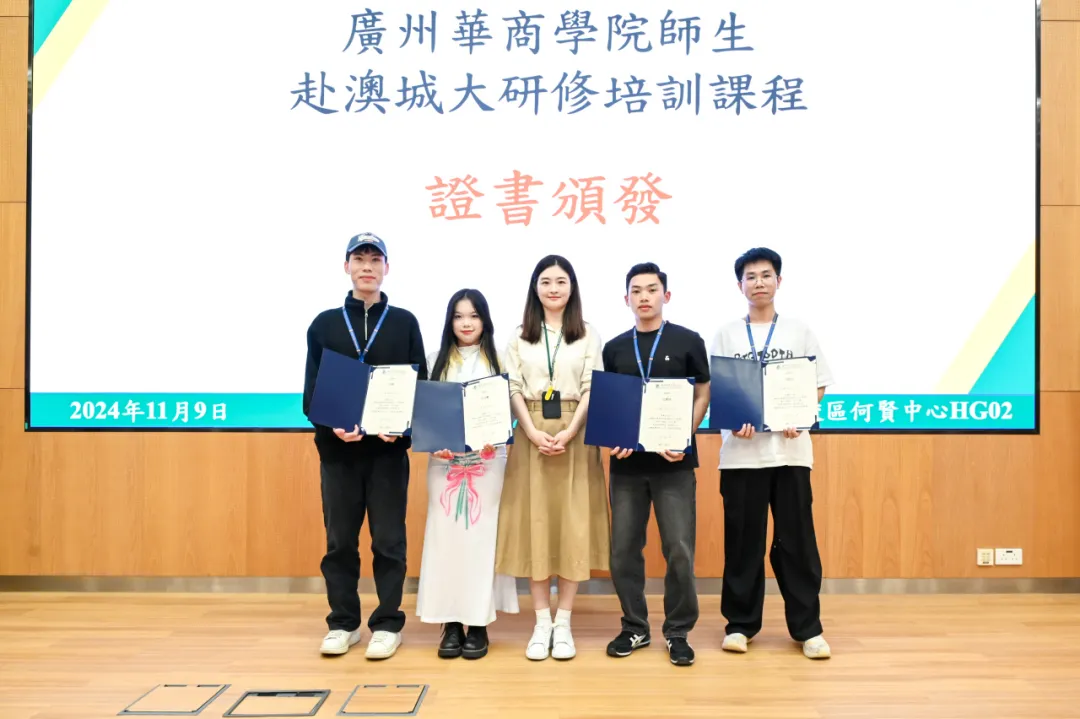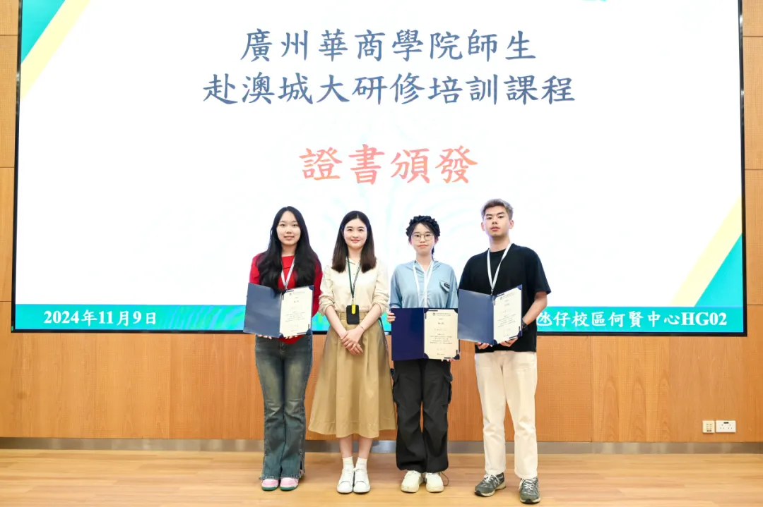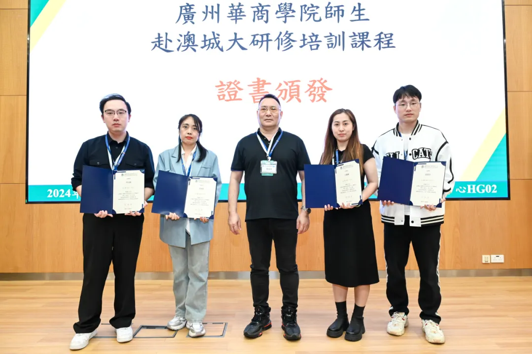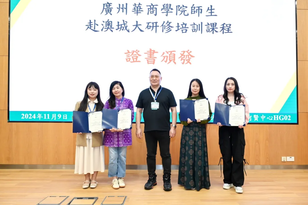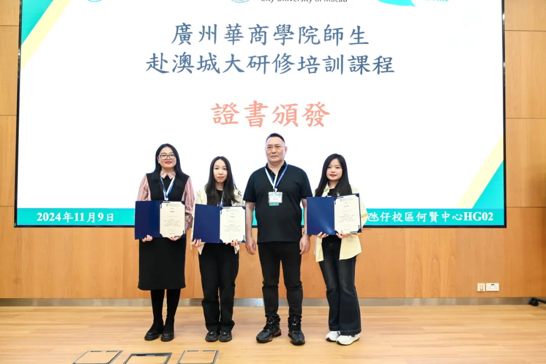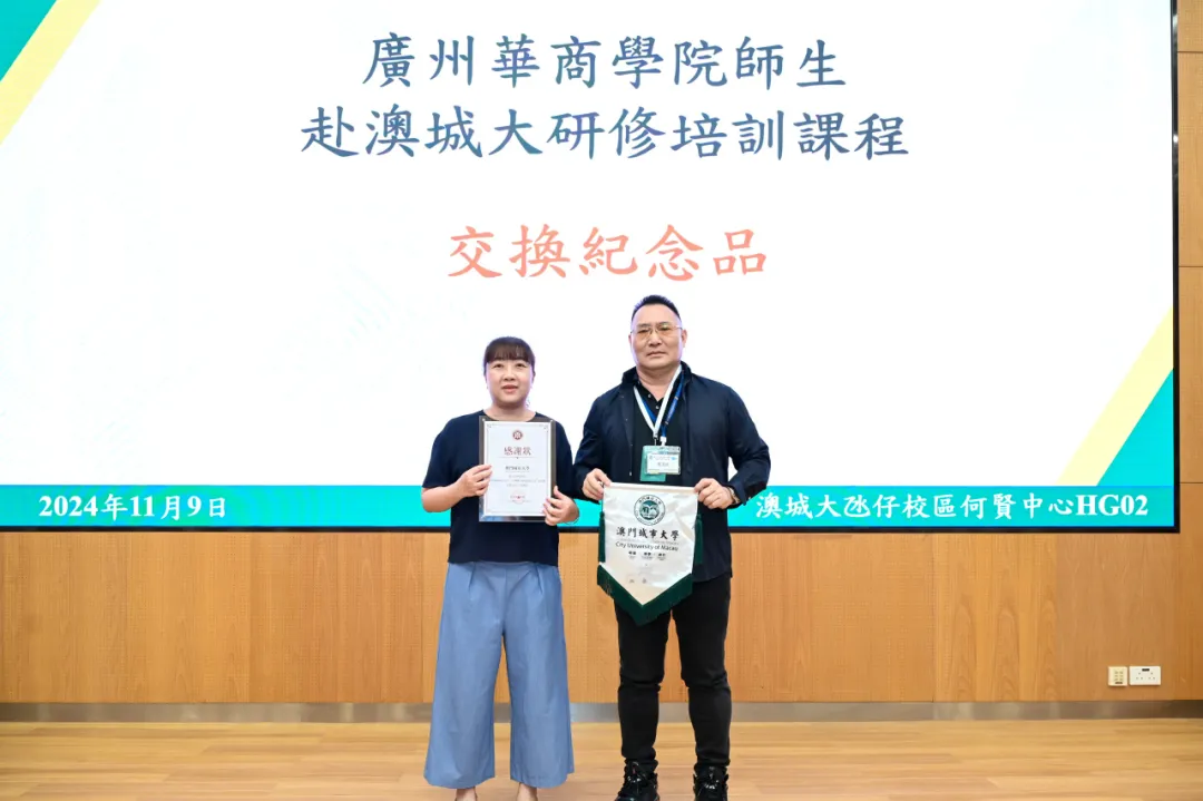讲座结束后,澳门城市大学国际培训与测试中心为研学团队师生颁发课程结业证书,我校与澳门城市大学国际培训与测试中心交换纪念品。