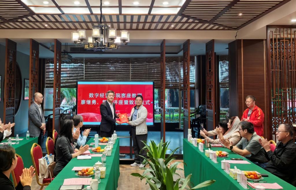 敦聘仪式伊始,数字经贸学院院长李广明教授详细介绍了廖继勇先生和曾昱先生的职业背景和学术成就。在热烈的掌声中,刘少波副校长代表学校向廖继勇先生和曾昱先生颁发新伟德国际1946客座教授聘书。廖继勇先生在受聘感言中分享了对未来合作的展望,表达了对教育事业的热忱和对学院发展的期待。