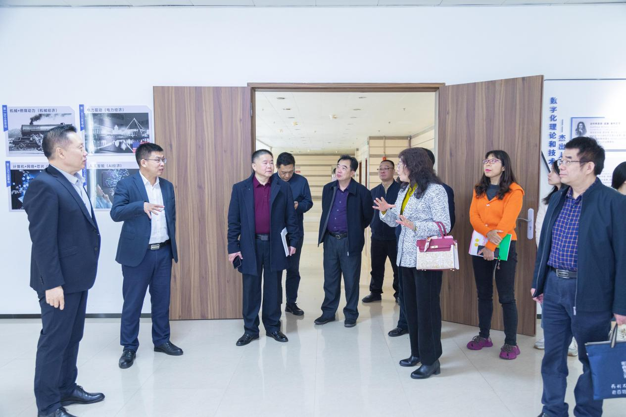 座谈会后,调研组一行在华商数字化技术与应用研究院院长彭秀东的陪同下,参观了数字化技术与应用展厅。展厅内的数字化技术内容科普和前沿科技成果展示依次呈现,调研组在参观的过程中不时驻足询问,对展出的内容表现出浓厚兴趣,并对展厅建设以及学校数字化平台发展给予了高度评价。