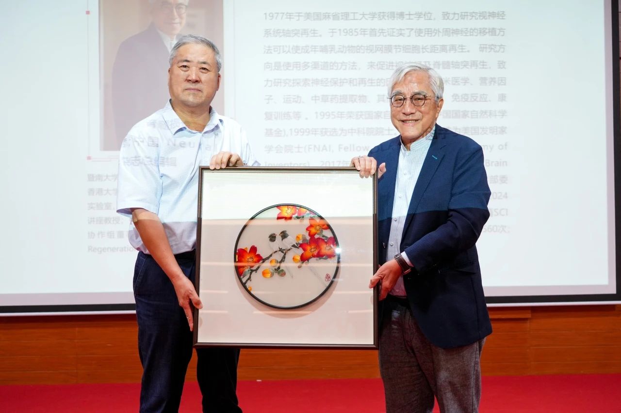 苏国辉院士作学术报告。他立足脑科学前沿,围绕神经系统研究领域进行了深入讲解,并重点提及了视神经再生研究。他还谈到,进行脑科学领域的相关研究,旨在希望能通过了解人类神经系统的结构功能与行为心理,改善人类的感觉与运动效率,从而增加治疗疾病的几率,为全人类的健康服务。
