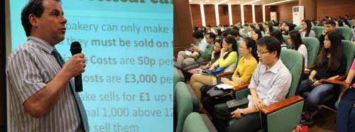 接着,Wayne Fiddler教授以“Decision Making and Uncertainty”主题授课,以一个Cupcake Bakery的游戏展开。在授课过程中,学生们积极与Wayne Fiddler教授互动交流。