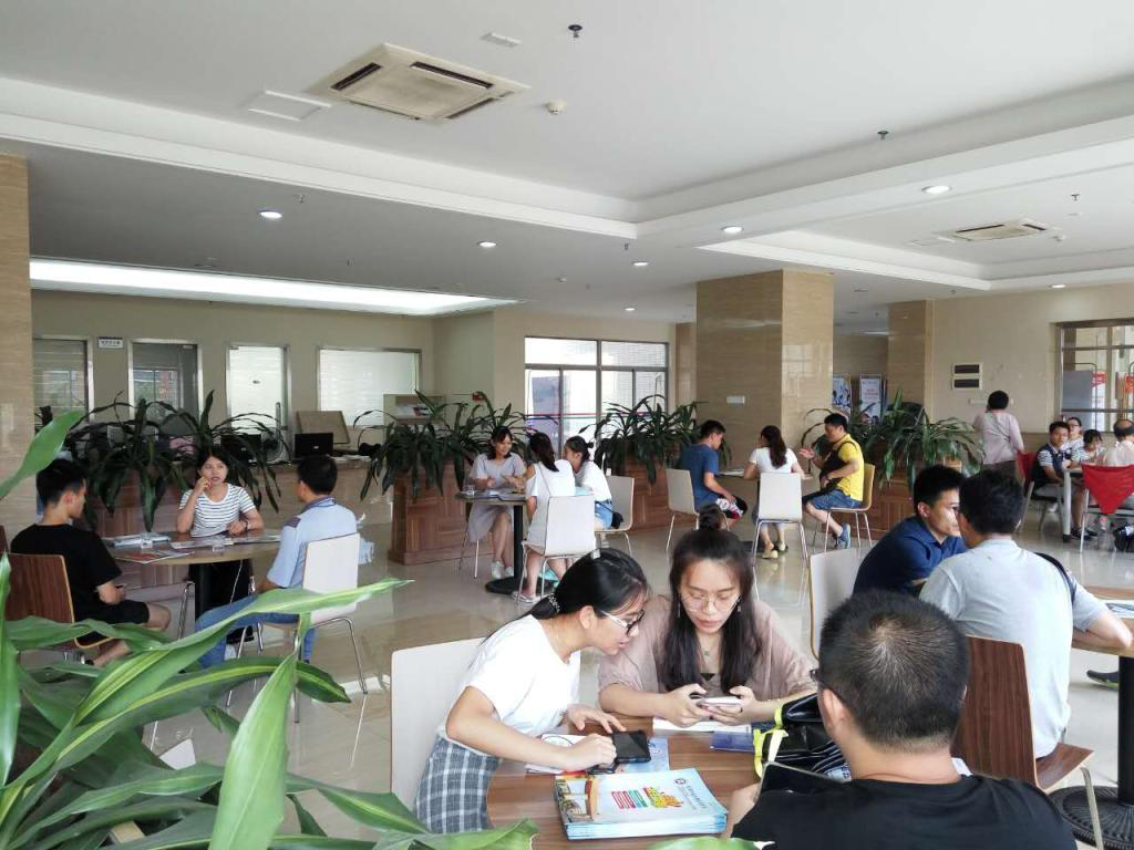 ▲来访考生及家长在行政楼一楼大厅咨询