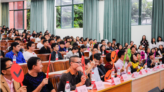 在比赛的最后一个环节,风险押分题环节。各参赛队伍都可以从10分题、20分题、30分题中选择两道题,但与前两个环节不一样,答错题则要扣分。各参赛队伍仔细考量了风险与分数之间的矛盾,做出了自己的抉择。现场气氛则更加紧张和刺激,对回答对的队伍给予佩服的掌声,对回答错的队伍亦报以鼓励的掌声。