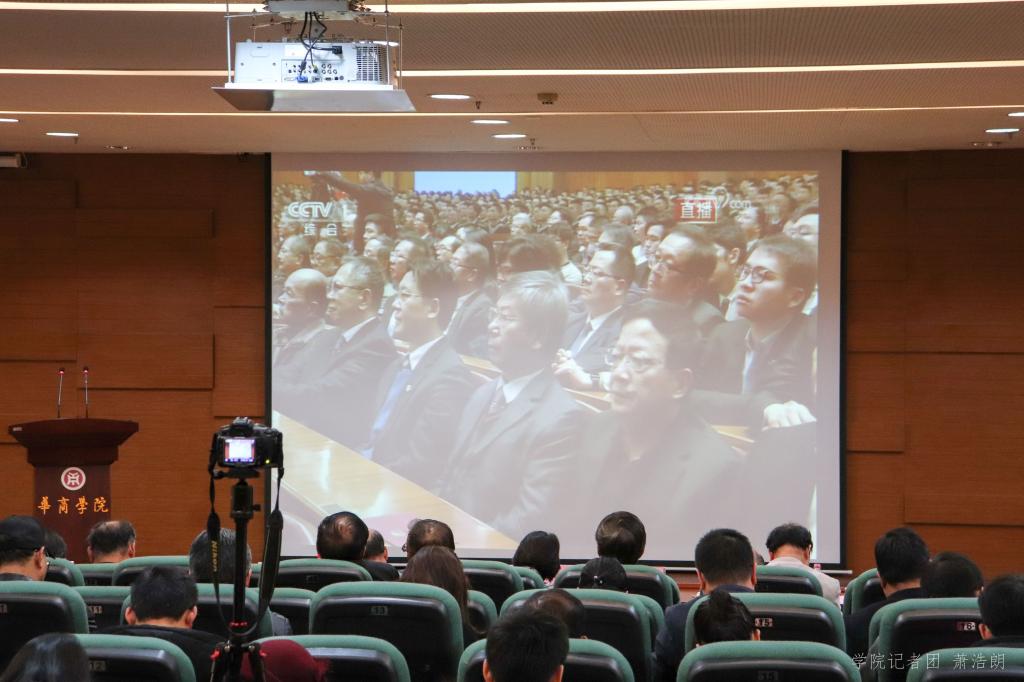 2018年12月18日上午10时,广东财经大学华商学院全体教职工于图书馆报告厅收看“庆祝改革开放40周年大会”视频直播。本次会议由党委苏宁书记主持,支戈壁副校长、龙少锋副校长、王锦秀副校长、陈美华副校长、程辛荣副校长、张捷副校长出席了本次会议。同时,校团委组织近三百名学生代表在分会场收看大会。