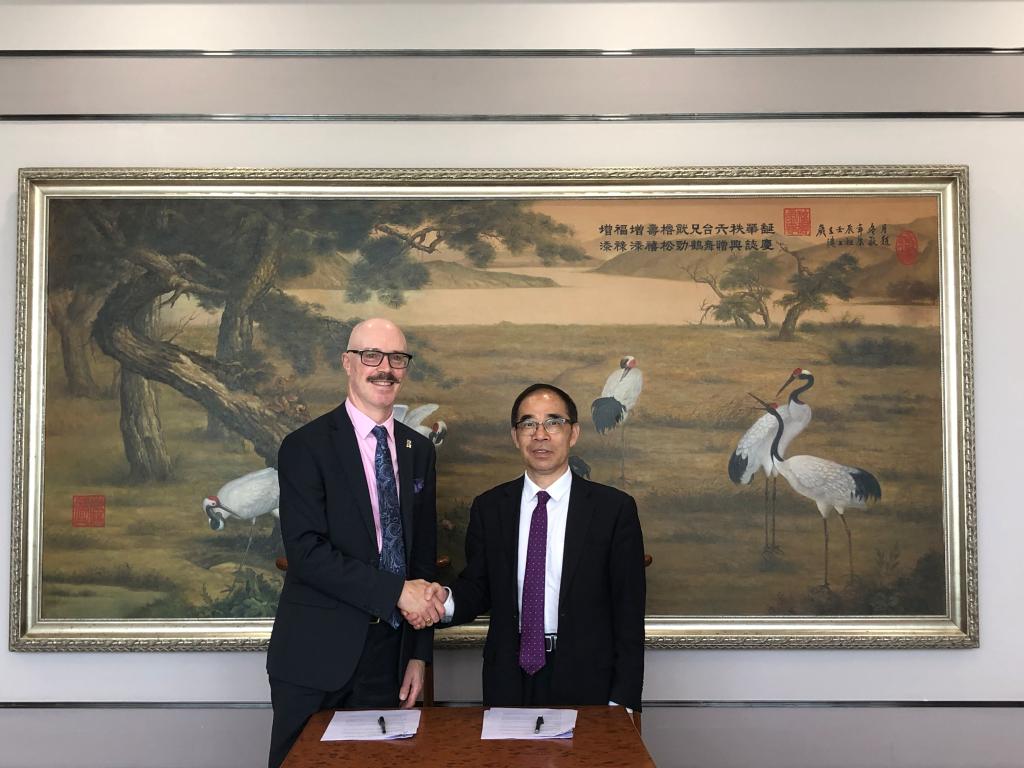 ▲OU副校长Gauld教授与我校执行校长郭银华教授签署合作协议