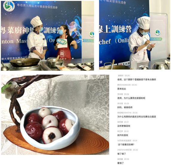 课程现场,粤菜厨神在线训练营Canton Masterchef (Online)周一叶老师为大家展示了广州增城特色点心“荔枝糯米糍”的制作工艺,作为高级中式烹调师及高级中式面点师,她向学员们详细讲解该点心从配料到制作摆盘的全流程,同学们与老师同步实操厨艺实践技能,互动问答,不亦乐乎;创业在线训练营Entrepreneurship Camp(Online)潘锦文老师,通过自己在阿里巴巴及诸多企业平台创业指导的经历,深入浅出地讲解“创业应如何面对挑战”,学员反响热烈,纷纷在直播间举手,与老师互动对话;全民造KOL在线训练营KOL Maker (Online)梁春燕则利用长期的直播带货数据积累以及经验分享,向学员介绍“直播带货”的基本规则,在项目分析过程中讲述“基地+达人直播+互动+供应链”直播电商模式的特色,同学们对此产生极大的共鸣,留言讨论,老师回复并解答,共探专业技能。