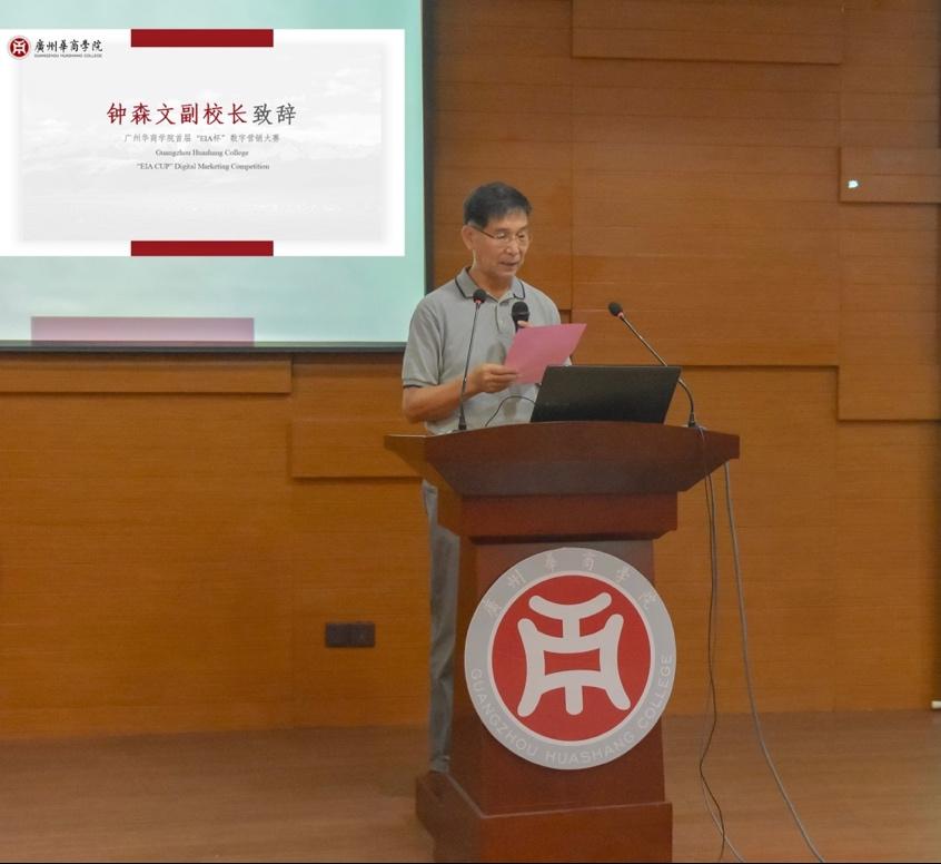 副校长钟森文首先致辞。他指出营销行业迅猛发展,最显著的特点就是营销的数字化,数字营销相关的知识是同学们工作中必不可少的工具。他鼓励同学们不仅要学会知识与技能,而且要培养认真踏实做事的态度,砥砺自己的意志,学有所成。钟校长表示“EIA杯”数字营销大赛是在数字营销课的基础上延伸出来的大赛,是很好的创意,他对老师和评委的辛勤工作以及澳洲中汇学院(EIA)的大力支持表示衷心感谢。