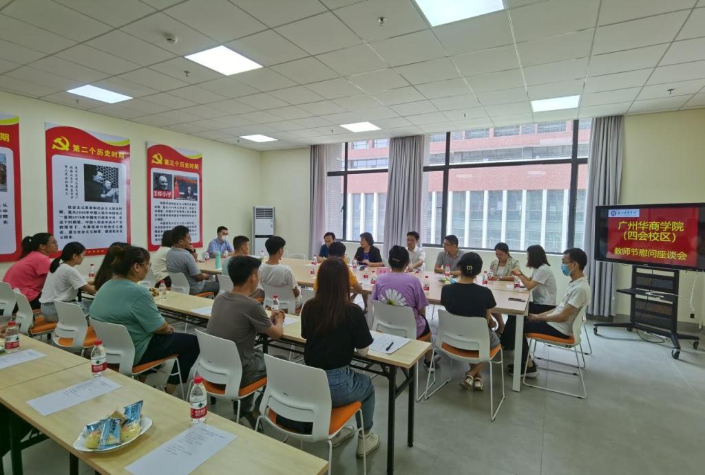 随后,在四会校区7号楼303会议室举行了教师节慰问座谈会。会议由人事处处长、工会副主席彭强主持,彭处长首先介绍了出席本次座谈会的领导,他讲到,教师是天底下最光辉的职业,也是最值得尊重的职业,希望老师要热爱这份职业,时刻牢记肩上的责任和使命。