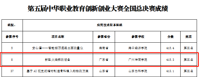 12月28日-30日,第五届中华职业教育创新创业大赛决赛在线上举行。本次大赛由中华职业教育社主办,广西壮族自治区党委统战部、广西中华职业教育社、广西壮族自治区人力资源和社会保障厅等承办。经过激烈角逐,我校《新型火焰探测设备》项目团队代表广东省参赛获得应用技术型本科组全国第三名。