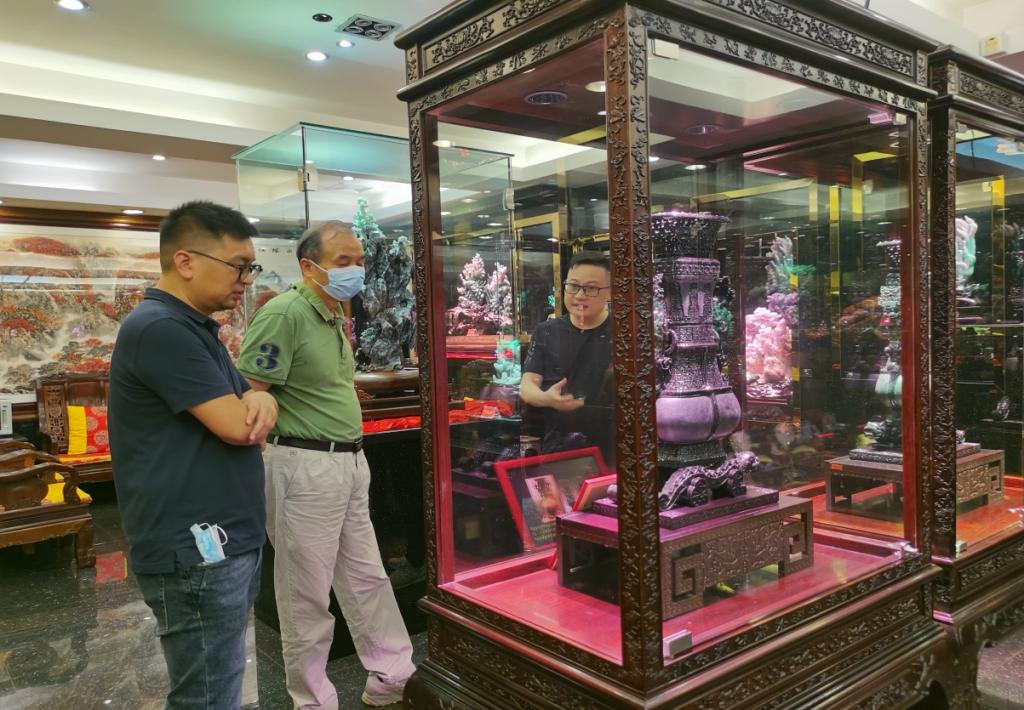 随后,王校长一行来到四会市珠宝行业头部企业A宝翡翠艺术馆。艺术馆负责人刘华兴热情接待并指引王校长一行参观了馆藏艺术品。