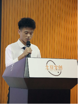 “土豆文创”项目负责人黄镇杰同学代表团队发言。他回顾了公司创立初期的策划与发展,以“益思趣科技”项目为起点,充分利用校内外资源优势,吸引了众多不同专业学科同学的加入,组建了以校内师生为主、校外企业专家顾问为辅的创新创业团队。项目团队多次在省级与校级“大学生创新创业竞赛”中取得理想成绩,不断深化企业定位,根据社会需求及市场痛点对自身项目作分析调整,在商业模式、创新优势、经济社会价值等方面进行打磨完善,具有较强的项目实施优势。