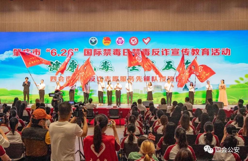 活动伊始,肇庆市禁毒办主任、市公安局党委委员、副局长李招德、团肇庆市委副书记陈素芳为四会市新增的校内禁毒反诈志愿服务宣传先锋队代表进行授旗,鼓励青年志愿者善用网络新媒体,充分发挥防范意识和能力较强等优势,开展常态化禁毒反诈志愿服务活动,以实际行动为维护社会和谐稳定作出积极的贡献。
