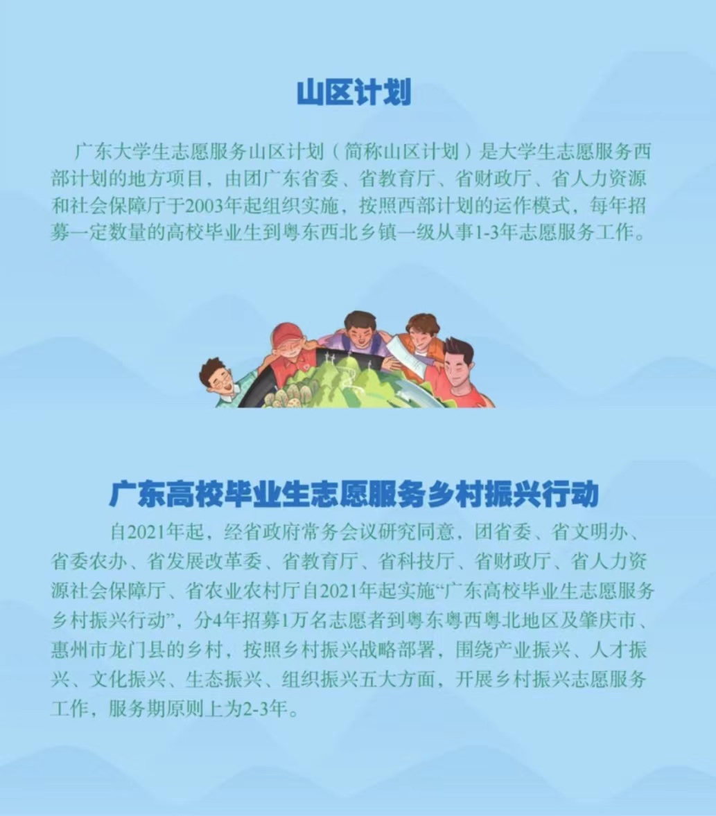 广东大学生志愿服务山区计划广东高校毕业生志愿服务乡村振兴行动是遵循我国“乡村振兴”战略,引导我校学生通过基层实践进一步坚定理想信念、锤炼意志品格、升华爱国情怀的实践育人工程的重要举措。