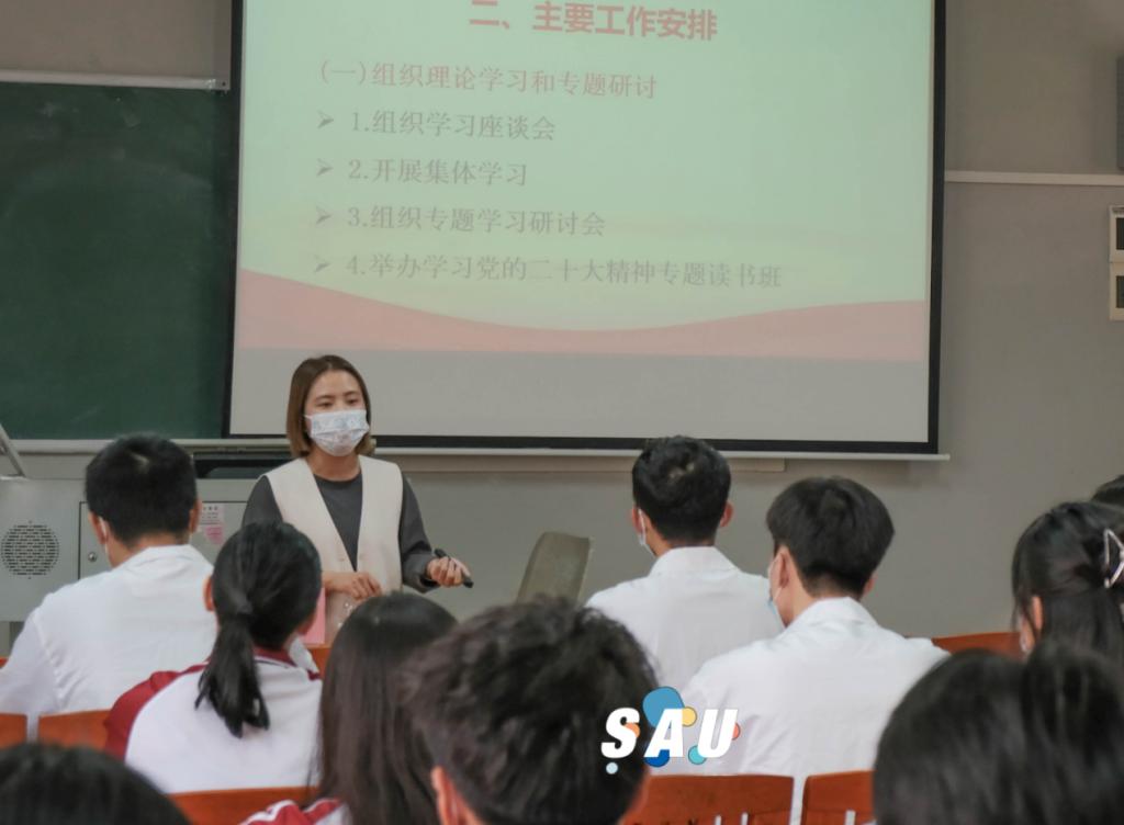随后,校团委杨图珍老师部署学生社团学习宣传贯彻党的二十大精神相关工作。她鼓励社团管理部、各社团要认真学习党的二十大精神,凝心聚力推动社团建设,组织开展形式多样、主题明确、生动有效的系列学习活动。社团成员要将党的二十大精神落实到自己的学业生涯和未来发展上、落实到以社团组织为载体的历练成长与打造社团品牌上,真正发挥学生社团落实立德树人根本任务、推进素质教育的作用。