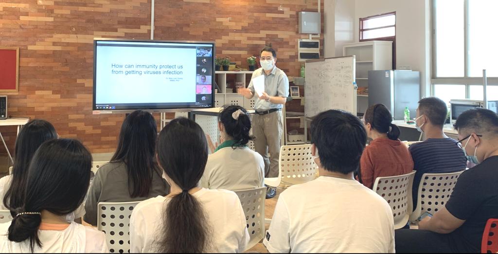 Dr.Huang为教师们讲解了各类细胞的作用和功能。她认为,我们的身体能够受到好的保护要归功于强大的免疫系统,强大的先天免疫力是防止病毒入侵的重要条件。她介绍人体在面对病原体时的具体工作过程,肯定了注射疫苗的必要性。她阐述了在后疫情的时代中,学术界对于新冠病毒的不同研究以及感染后的不同症状,运用权威的文章数据比较总结了更易感某种特定病毒的人群以及注射疫苗后的病毒感染情况。Dr.Huang真诚地建议大众们需要努力提高自身免疫力,拥有强壮的体魄,加强防疫意识。