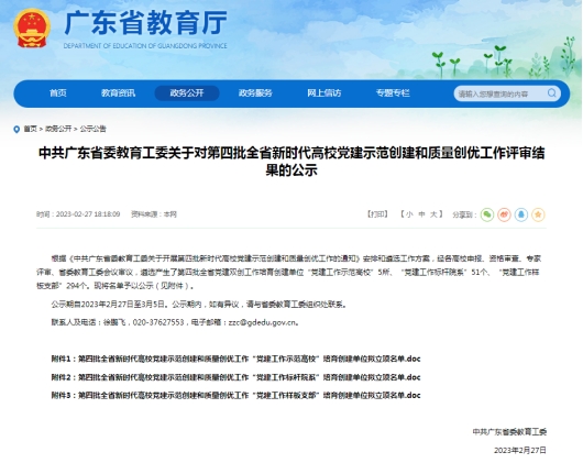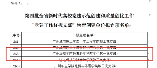 根据《中共广东省委教育工委关于开展第四批新时代高校党建示范创建和质量创优工作的通知》安排,经各高校申报、资格审查、专家评审、省委教育工委会议审议,遴选产生了第四批全省党建双创工作培育创建单位“党建工作示范高校”5所、“党建工作标杆院系”51个、“党建工作样板支部”294个。其中,我校数据科学学院学生第一党支部获评“党建工作样板支部”。
