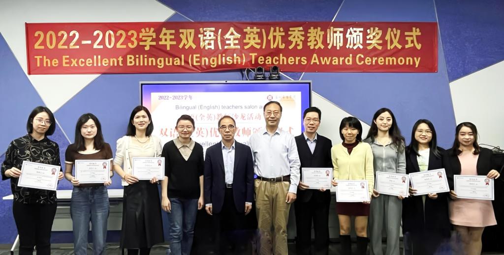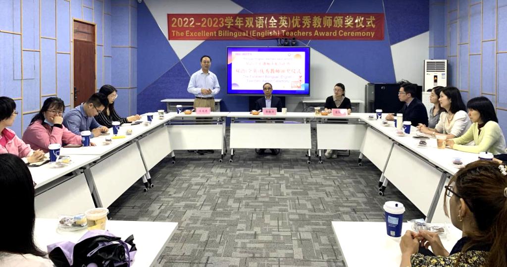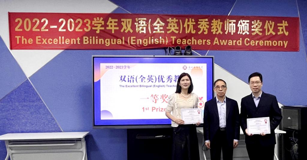 王文忠处长宣读2022-2023学年双语(全英)优秀教师获奖教师名单。他们分别是:一等奖周国辉、罗碧慧;二等奖陈蒙梦、周敏仪;三等奖梁驰云、曹维、张锐嘉、张怀宁;郭银华校长、黄静萍副处长为获奖教师颁奖。