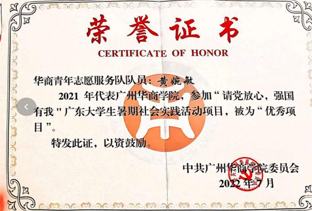 投身志愿服务,锤炼品德修为。她积极响应号召,多次参与校园核酸检测、挥春送福、志愿清扫等校内志愿服务。深入实践,增长才干。时刻关注党的重要方针和政策,学习党的最新思想理论成果,做到理论指导实践,利用课余时间提升专业相关理论知识和专业操作技能。积极参加“三下乡”暑期社会实践,深入调研,探寻真理,以实际行动诠释新时代青年的奉献精神和使命担当。