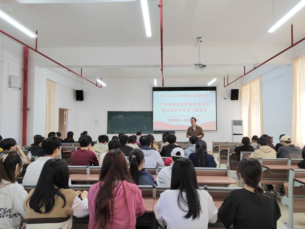 为深入学习宣传贯彻党的二十大精神,扎实开展学习贯彻习近平新时代中国特色社会主义思想主题教育,深入开展调查研究,加强学生骨干思想建设,4月26日上午,经济贸易学院兼职辅导员梁敏琪赴四会校区开展谈心茶话会;下午,经济贸易学院召开22级学生骨干座谈会,学院党委副书记宋元跃出席并主持座谈会,学院团委书记曾庆威、兼职辅导员梁敏琪以及2022级全体学生骨干参加会议。