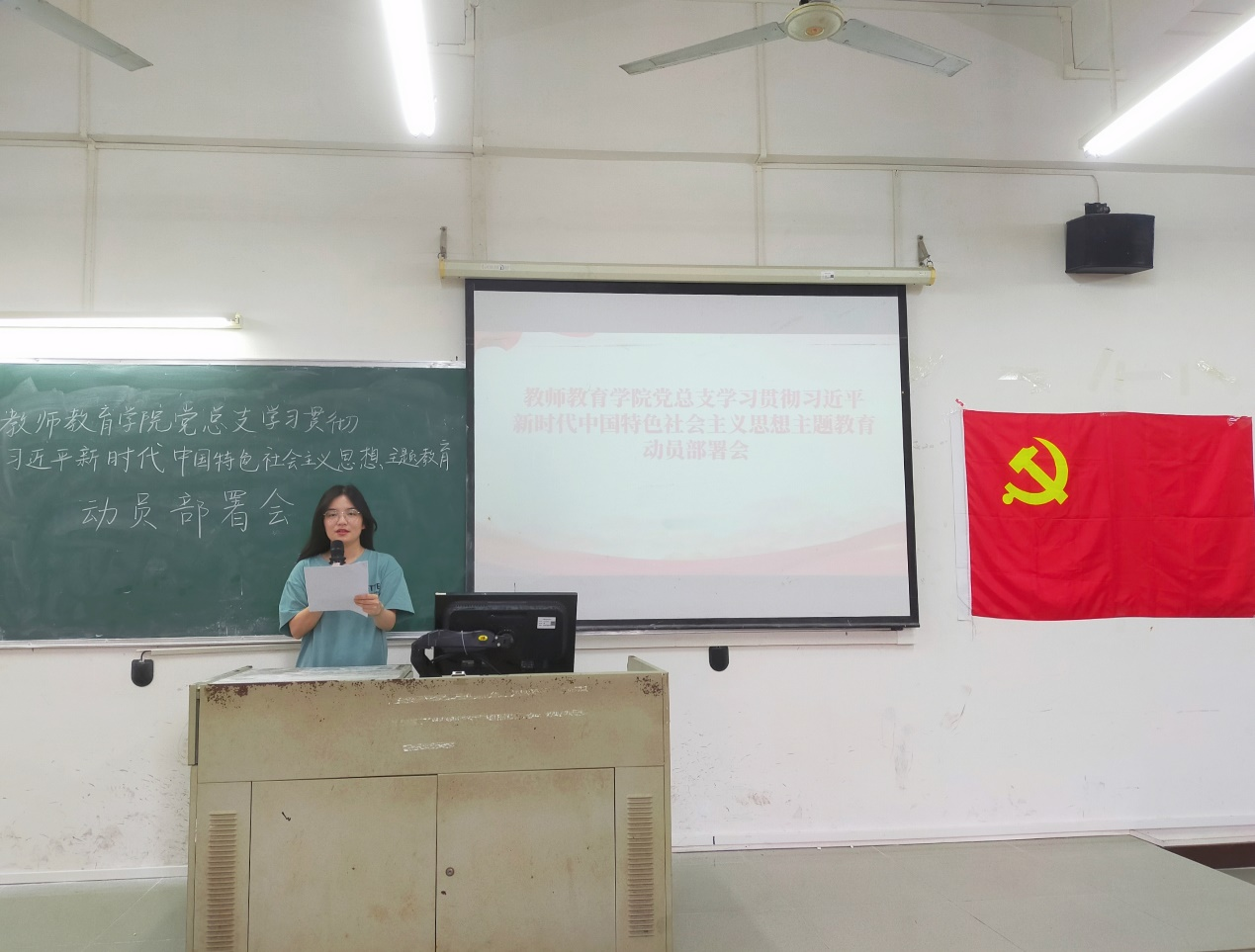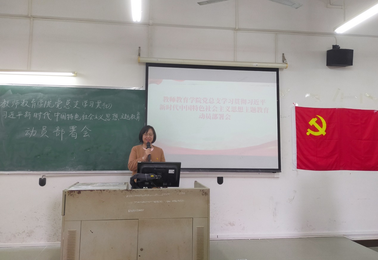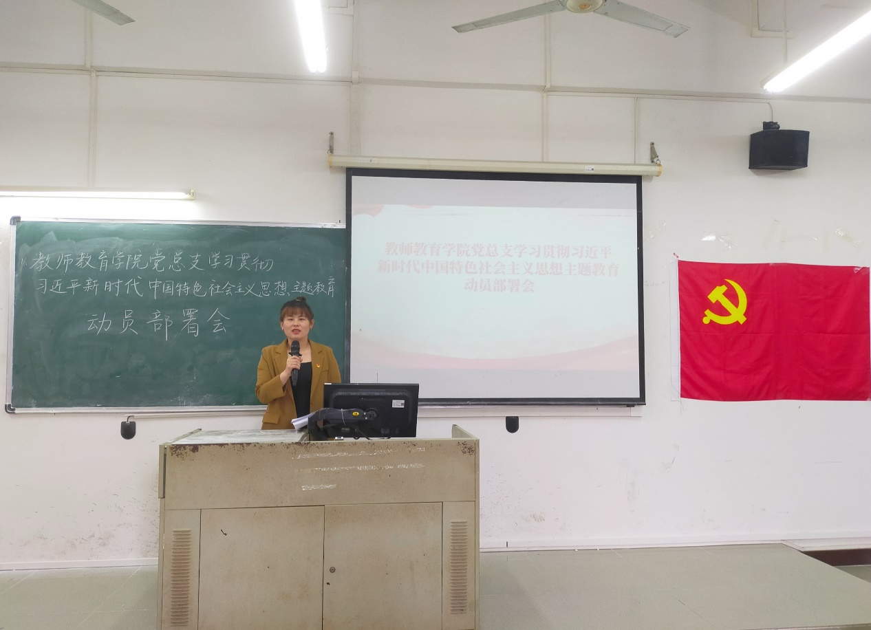 为扎实推进学习贯彻习近平新时代中国特色社会主义思想主题教育,全面领会习近平新时代中国特色社会主义思想的基本观点、科学体系、精髓要义和实践要求,教师教育学院党总支于2023年5月4日中午12:30,在厚德楼C201召开学习贯彻习近平新时代中国特色社会主义思想主题教育动员部署会。本次会议参会人员为教师教育学院全体党员同志,会议由教师教育学院党总支组织委员梁思婷同志主持。