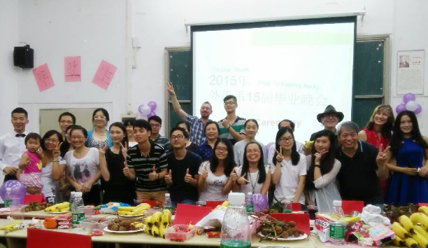 2015年6月16日晚上,外语系毕业生交流晚会在励志楼隆重举行。罗德芬主任、陈少鸿副主任、芦有珍副教授,唐伟清副教授、外教Tom、Lori、David、中山祥等教师出席本次交流会。师生共聚一堂,其乐融融。