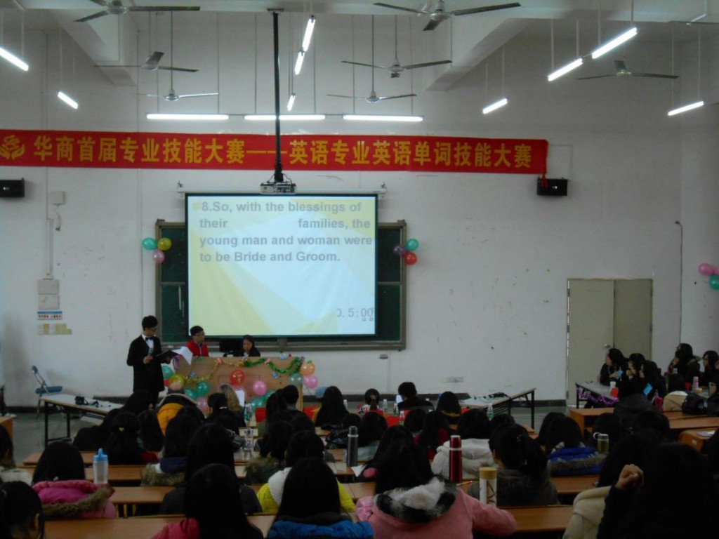 为了提高我系英语专业学生的英语应用能力和学习兴趣,考核学生的词汇积累,基础知识的实践能力。我系于2013年12月17日下午3:00在励志楼C308举行首届华商学院英语专业单词技能大赛决赛。出席本次比赛的有外语系主任唐正秋老师,英语专业教研室主任费小佳老师及其他英语专业教研室老师,两位英语外教Thomas Alan Dyer,Loretta Furrow,还有参加决赛选手以及学生观众。