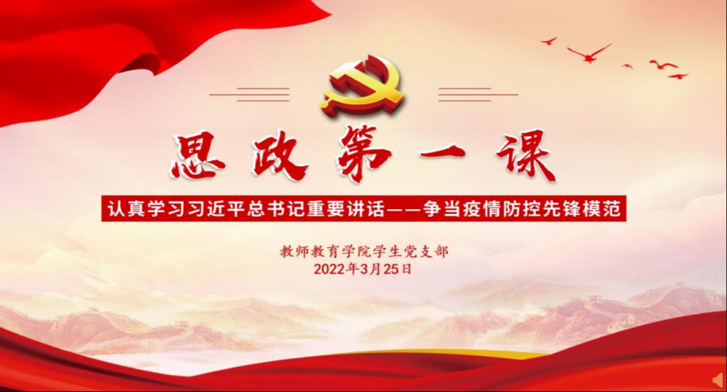为全面贯彻党的教育方针,深入落实《关于深化新时代学校思想政治理论课改革创新的若干意见》精神,加强学院思政课建设,充分发挥思政课在立德树人中的关键作用。3月25日中午,教师教育学院党总支彭博娜副书记以“学习习近平总书记重要讲话——争当疫情防控先锋模范”为主题为教师教育学院学生党支部党员、预备党员以及入党积极分子进行“思政第一课”线上授课,本次党课由教师教育学院学生党支部杨萌同志主持。
