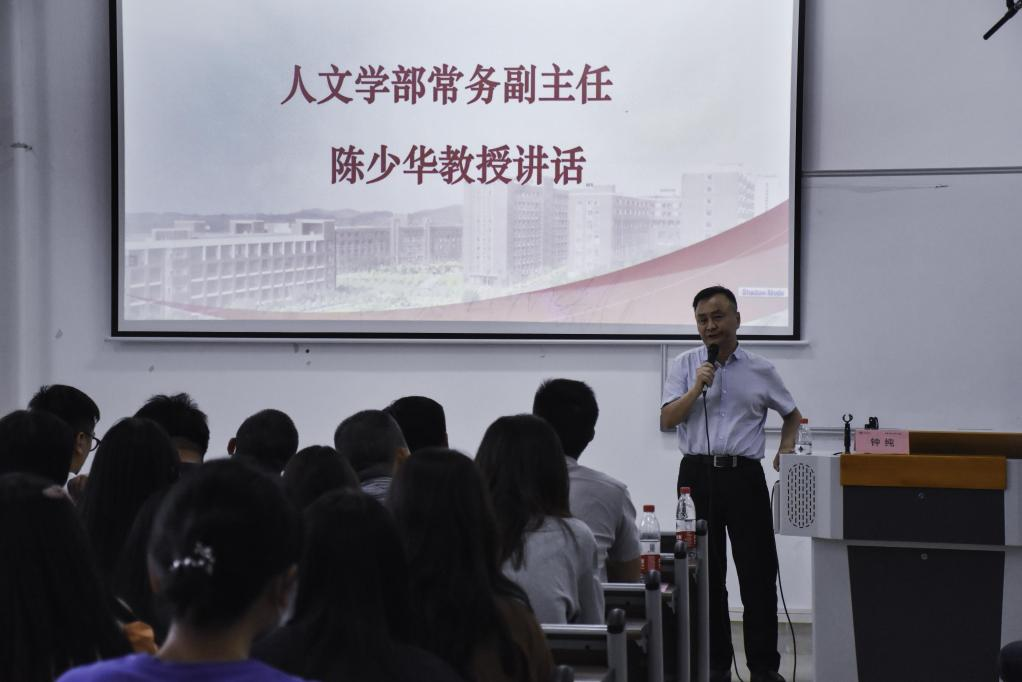 最后,人文学部常务副主任陈少华教授对新生们提出了几点殷切希望。他希望大家能读出大学的滋味,热爱生活,追求学术,希望回首大学时光不会感到后悔,希望大家都有对自己的规划,把现代的信息赋能到自己的创意设计当中,在学习当中塑造自己。继续深造的时光中,勤学习、善思考、重实践,努力提升自我、度过无悔青春,为大学生活画上圆满的句号。