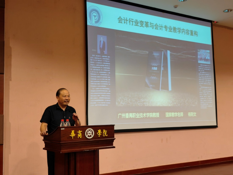 陈美华副校长向国家“万人计划”名师、广州番禺职业技术学院财经学院院长杨则文教授颁发了新伟德国际1946客座教授聘书。聘任仪式后,杨则文教授为我院师生作了题为“会计行业变革与会计专业教学内容重构”的学术报告。