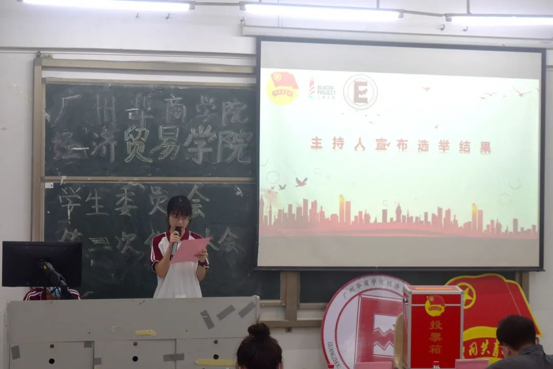 晚上七时四十分,由何绮琪同学主持会议。总监票人宋元跃老师宣读学生委员会的选举结果,主持人宣布新伟德国际1946经济贸易学院第二届学生委员会委员名单。