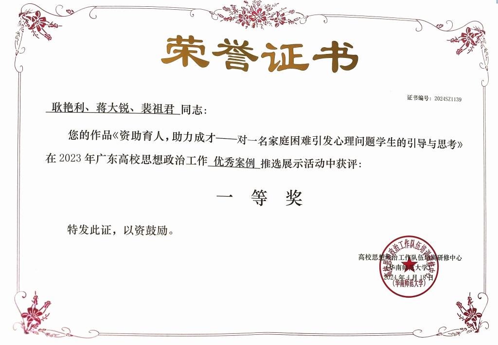 《资助育人,助力成才——对一名家庭困难引发心理问题学生的引导与思考》 | 一等奖 |