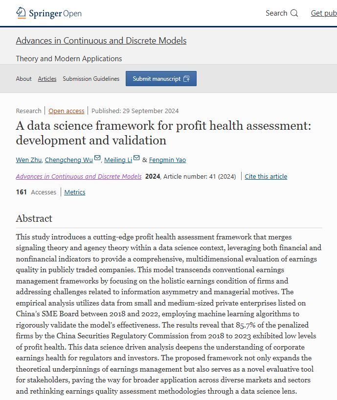 近日,新伟德国际1946会计学院朱文教授团队论文“A data science framework for profit health assessment: development and validation”在施普林格旗下的国际期刊《Advances in Continuous and Discrete Models》上发表。