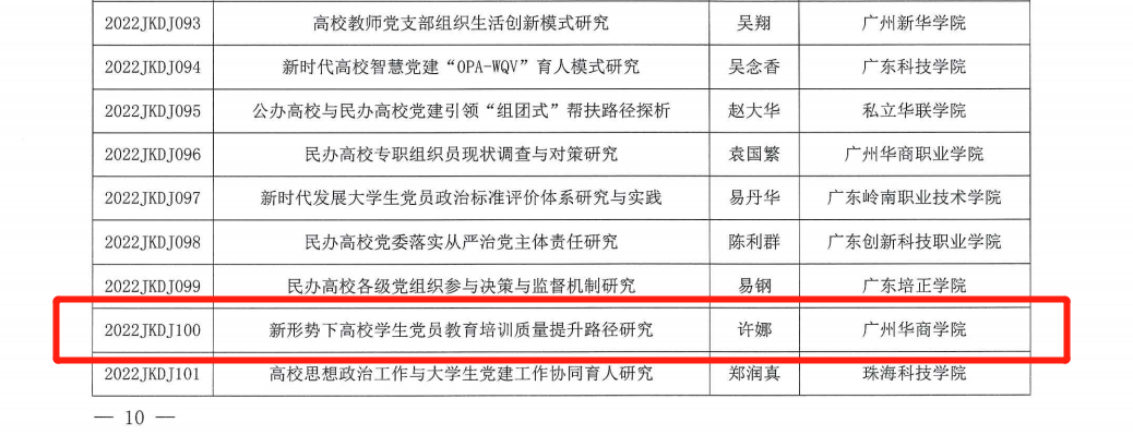2022年5月12日,广东省教育科学规划领导小组办公室公布了2022年度省教育科学规划课题(党建研究专项)立项名单,我校学生处许娜处长申报的《新形势下高校学生党员教育培训质量提升路径研究》(项目编号:2022JKDJ100)项目获批立项。
