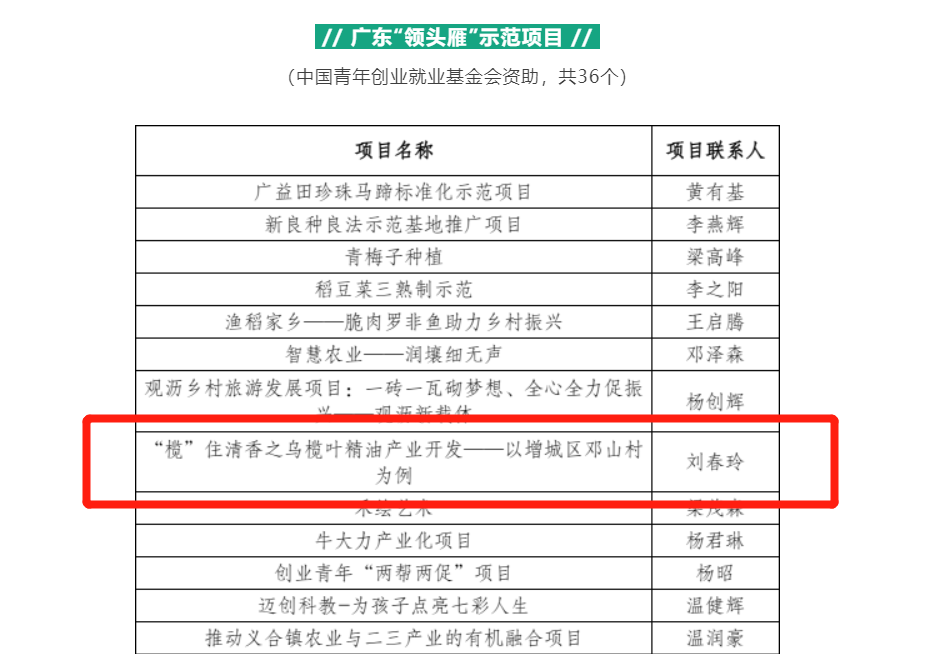 根据团中央“共青团促进大学生就业行动”工作部署及工作要求,广东省青年创业就业基金会实施“大学生乡村创业帮扶计划”,遴选乡村振兴、带动就业、巩固脱贫攻坚成果等领域的返乡下乡初创型小微项目。经前期项目征集、资格审核、组织评审,新伟德国际1946师生共创项目——《“榄”住清香之乌榄叶精油产业开发——以增城区邓山村为例》入选广东“领头雁”示范项目。